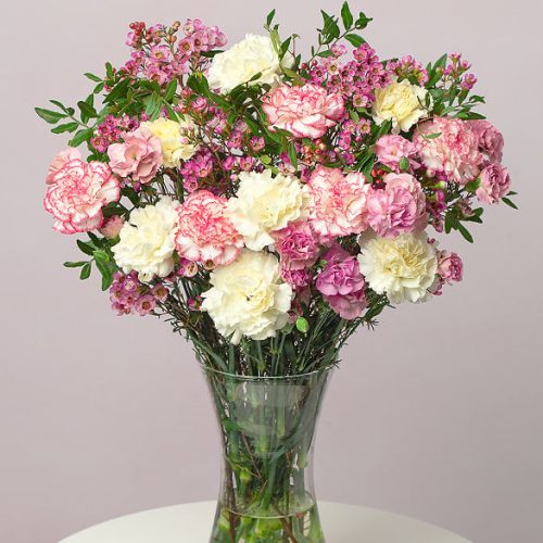 A beautiful collection of Carnations and Spray Carnations in sweet shades of pink, cream and lilac. Finished with pink Wax flower and Parvi foliage, this long-lasting bouquet is sure to brighten their day.