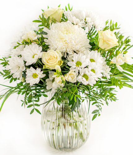 This beautiful white bouquet of chrysanthemums, roses, freesia and pistache greenery is the definition of elegance. Delivered in bud to extend their beauty, the flowers gradually open after arrival for a lasting floral experience. Carefully packed in a protective Euroflorist box, they arrive safe, fresh, and ready to delight with every unboxing. Tracked delivery allows you to follow your surprise from dispatch to doorstep. A stunning bouquet of pure grace, offering top quality at an irresistible price.