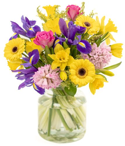 Bursting with yellow germini, pink roses and bold blue iris, this bouquet is perfect for sending a little sunshine to someone’s door. Sent via a tracked courier service in a secure Eflorist box.