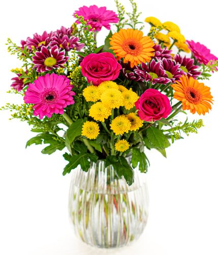 Sweet Spring contains a mix of pink and orange germini, spray chrysanthemums complemented by a cerise rose that takes centre stage in this bouquet. Sent in a protective Eflorist box, this bouquet arrives in bud to ensure lasting freshness for the lucky recipient. With just a splash of water and our included flower food, the blooms will gracefully open up within two days. And with tracked delivery, you can relax knowing exactly when your surprise is delivered. These flowers are a great inexpensive way to brighten up every occasion.